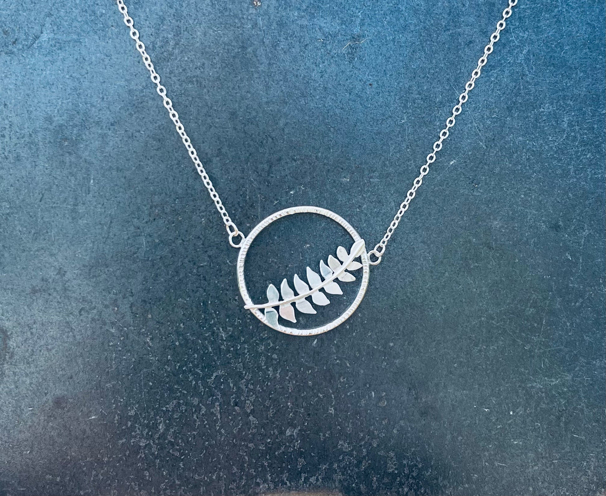 This lightweight sterling silver necklace features a textured circle embellished with a leaf which has been cut out by hand using a fine saw. Matching earrings are also available.